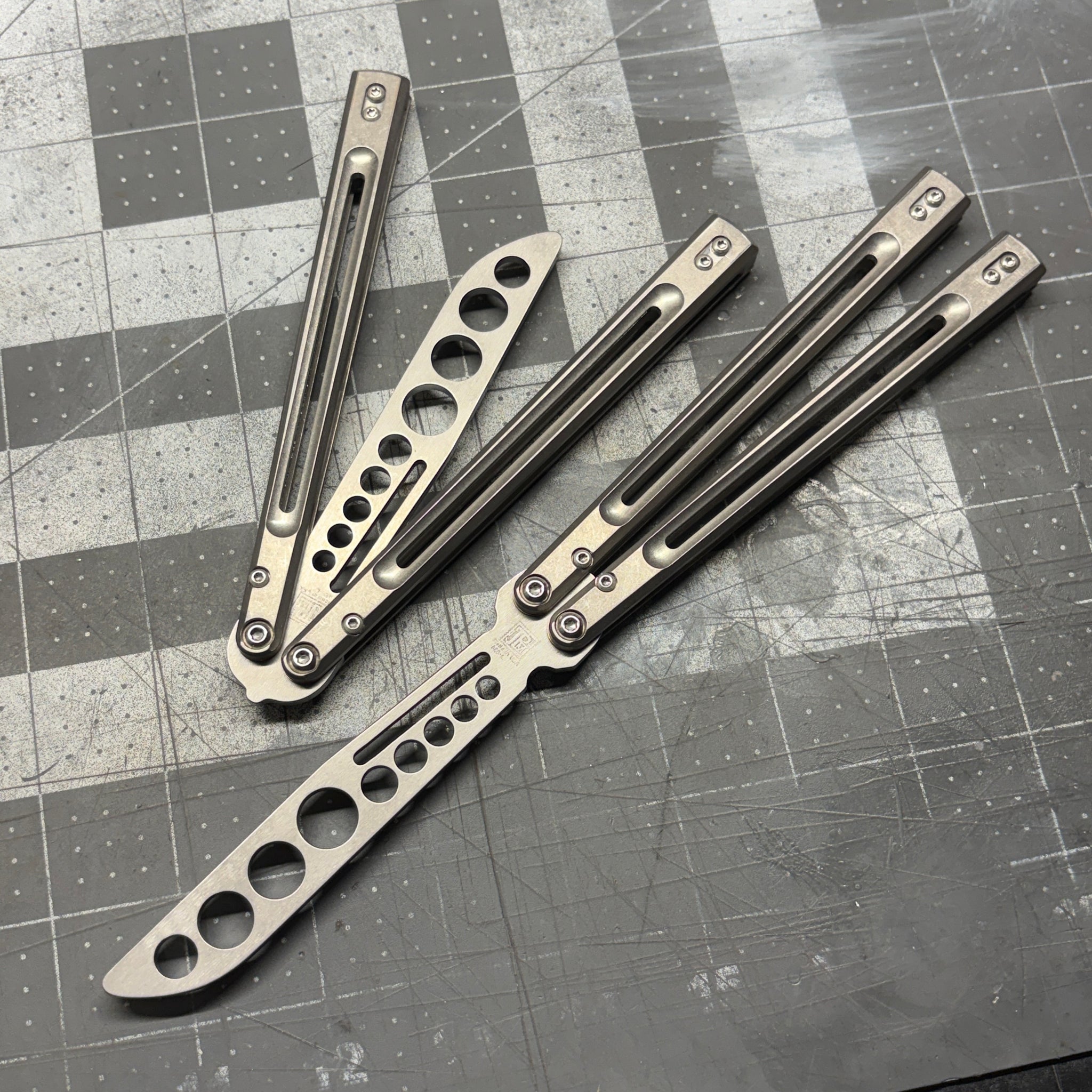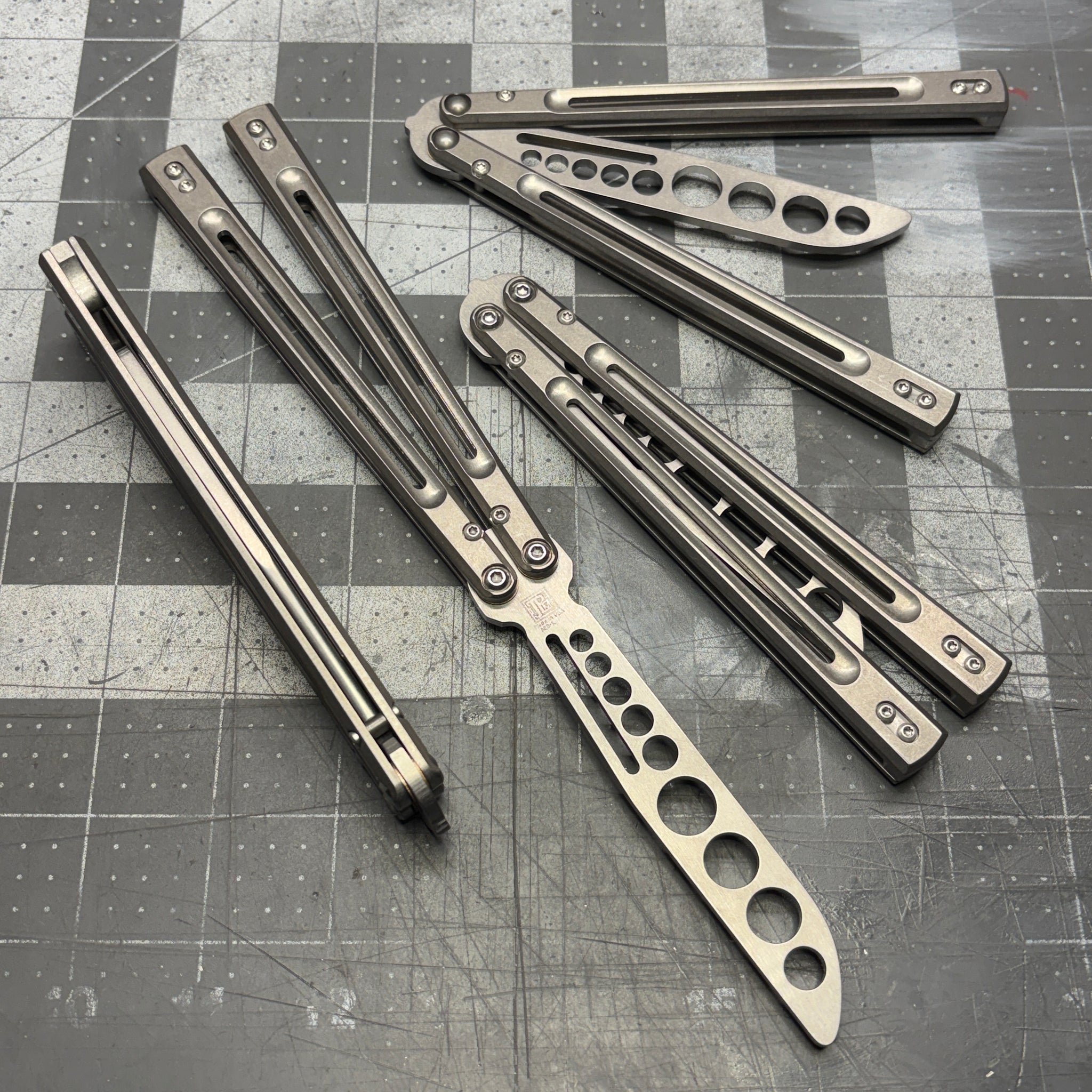 Stonewashed AEB-L Stainless Steel Trainer Blade, Stonewashed 6Al4V Titanium handles and Aluminum spacers, SS bushings, zen pins