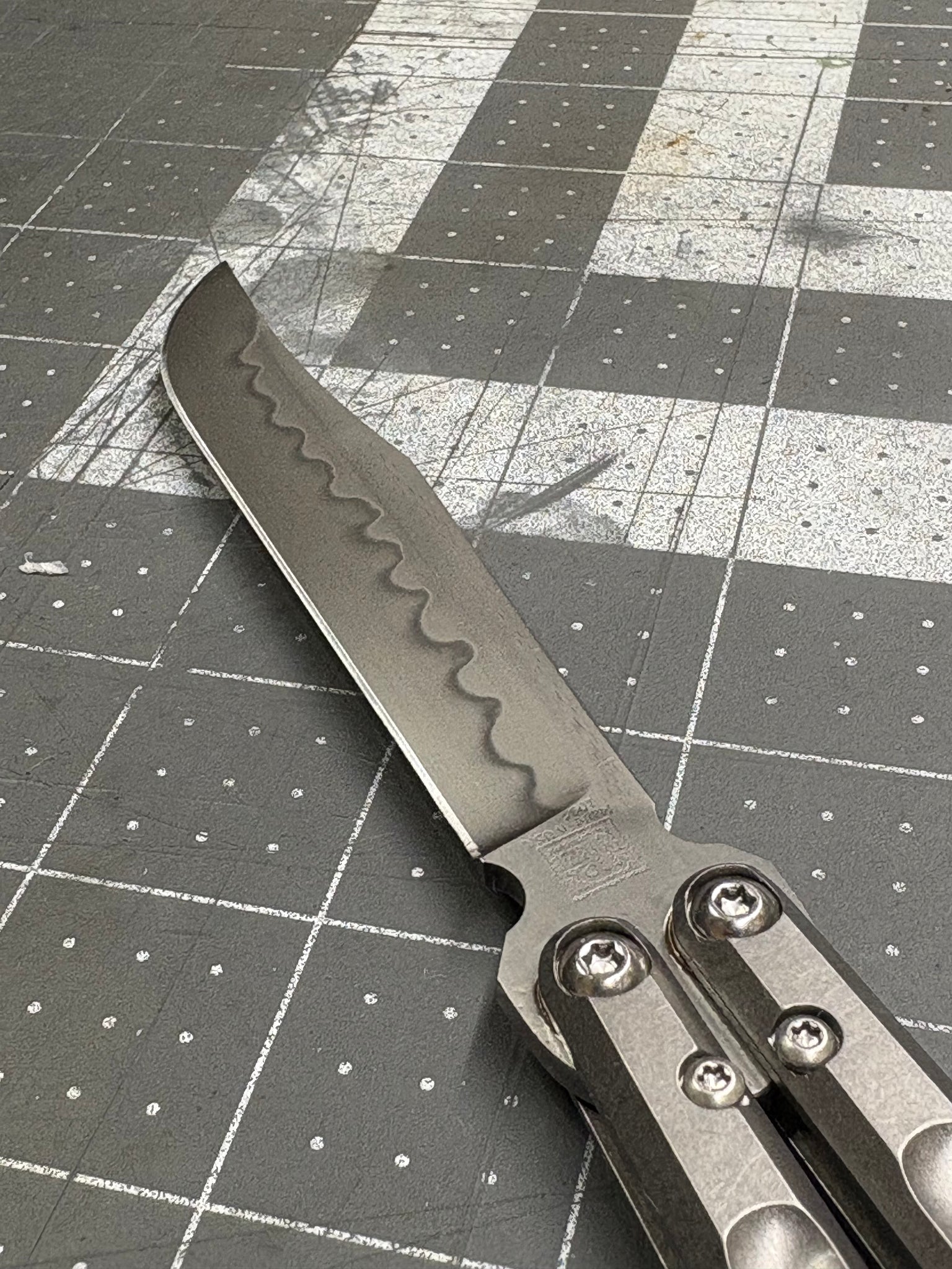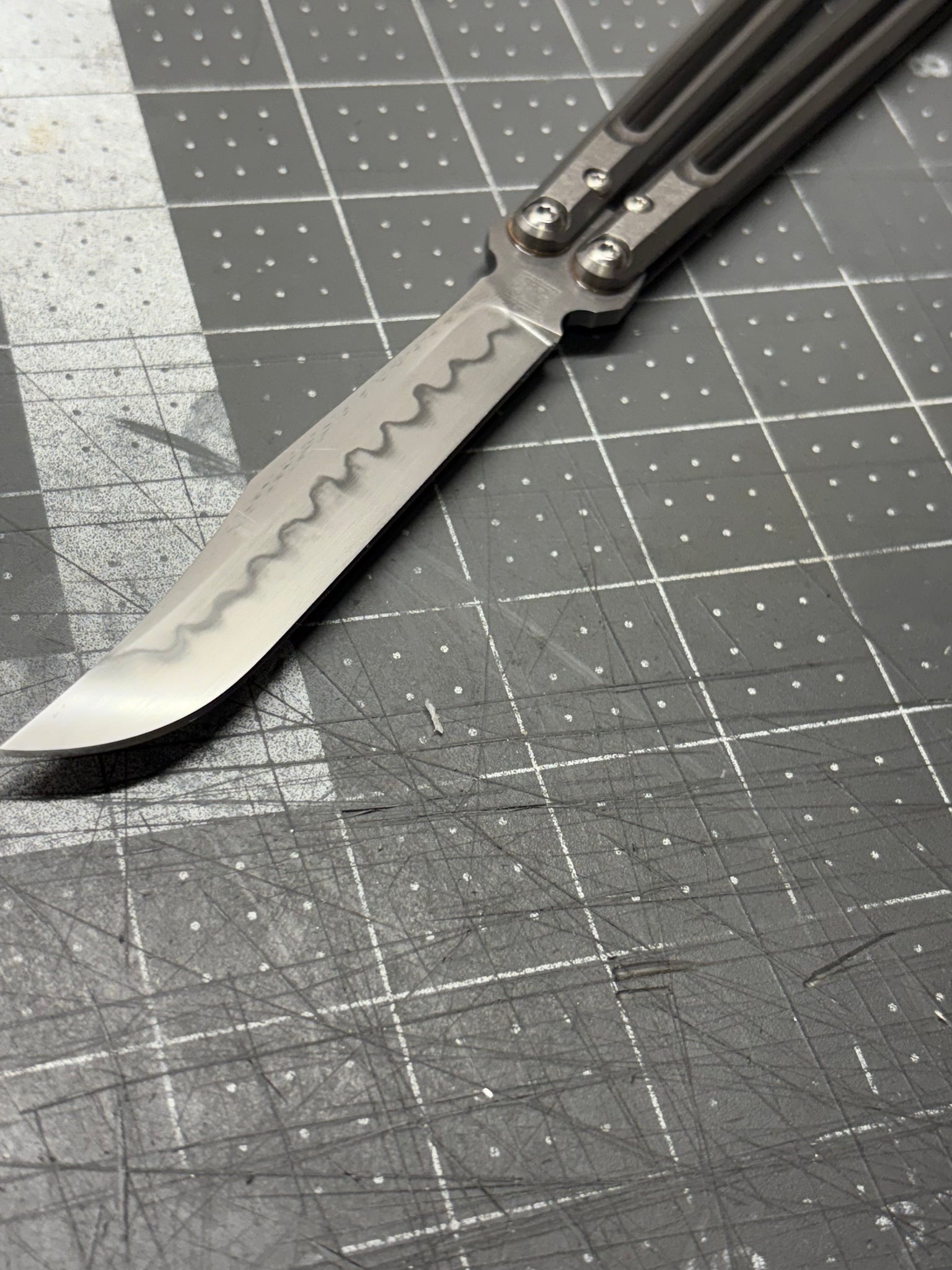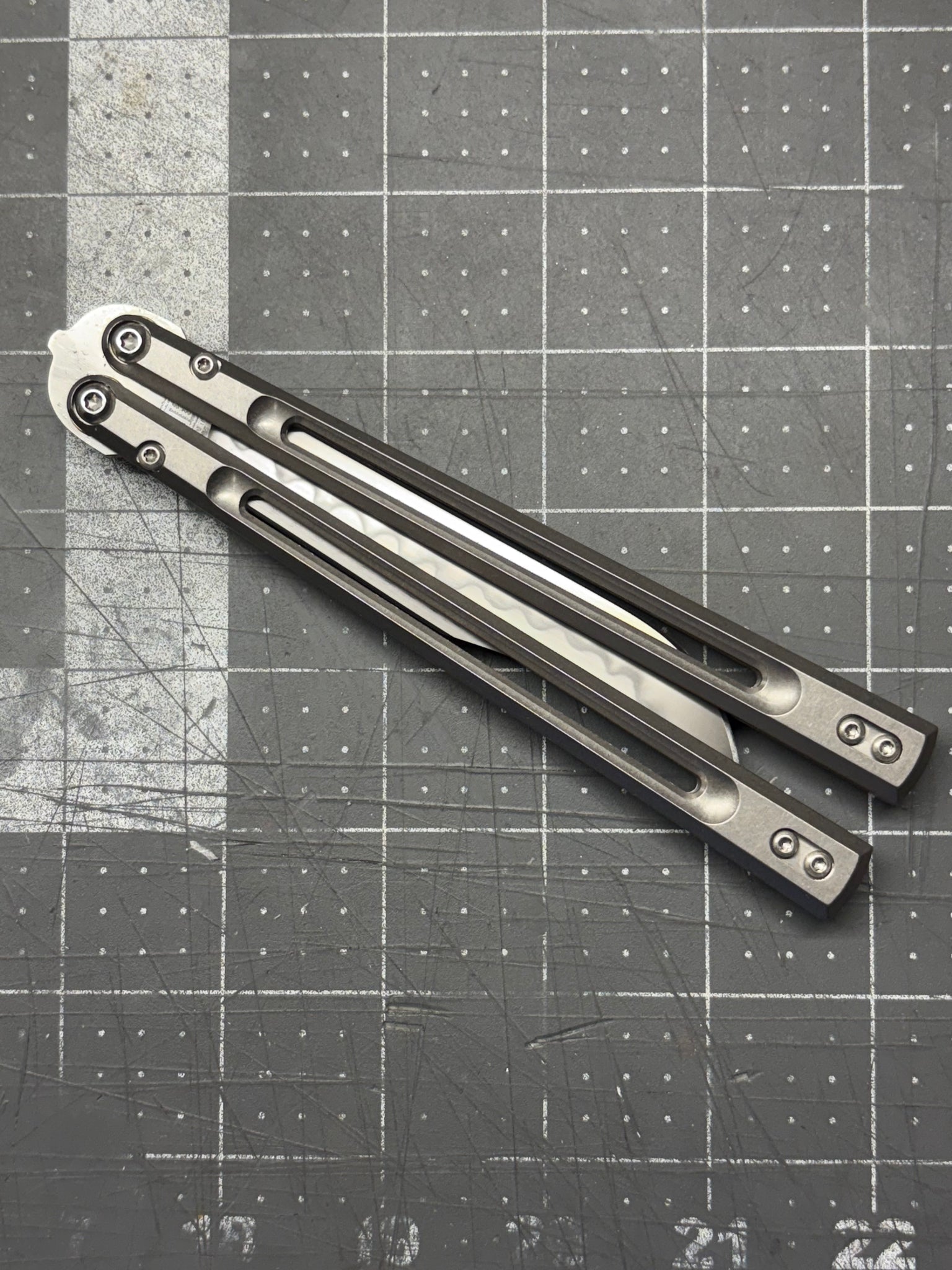 Hand Ground 1095 w/Hamon Blade, Stonewashed 6Al4V Titanium handles and spacers, SS bushings, zen pins