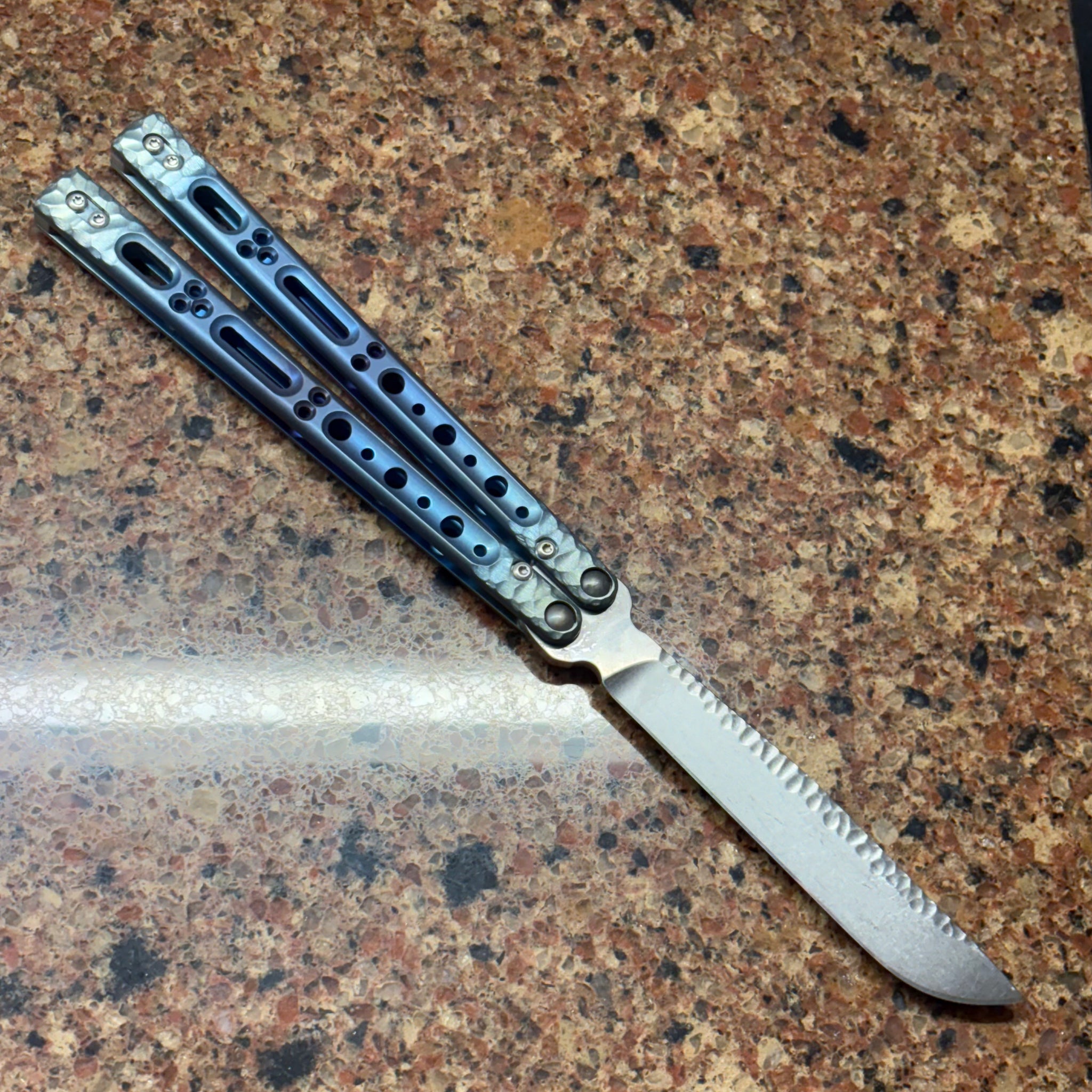 Double Fade Anodized Handles (light/Dark/Light Blue) 6al-4v Titanium handles/spacers, Stainless bushing and zen pins. Hand-textured Blade and Handles